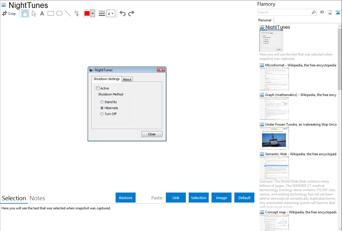 Flamory helps you capture and store screenshots from NightTunes by pressing a single hotkey. It will be saved to a history, so you can continue doing your tasks without interruptions. Later, you can edit the screenshot: crop, resize, add labels and highlights. After that, you can paste the screenshot into any other document or e-mail message.