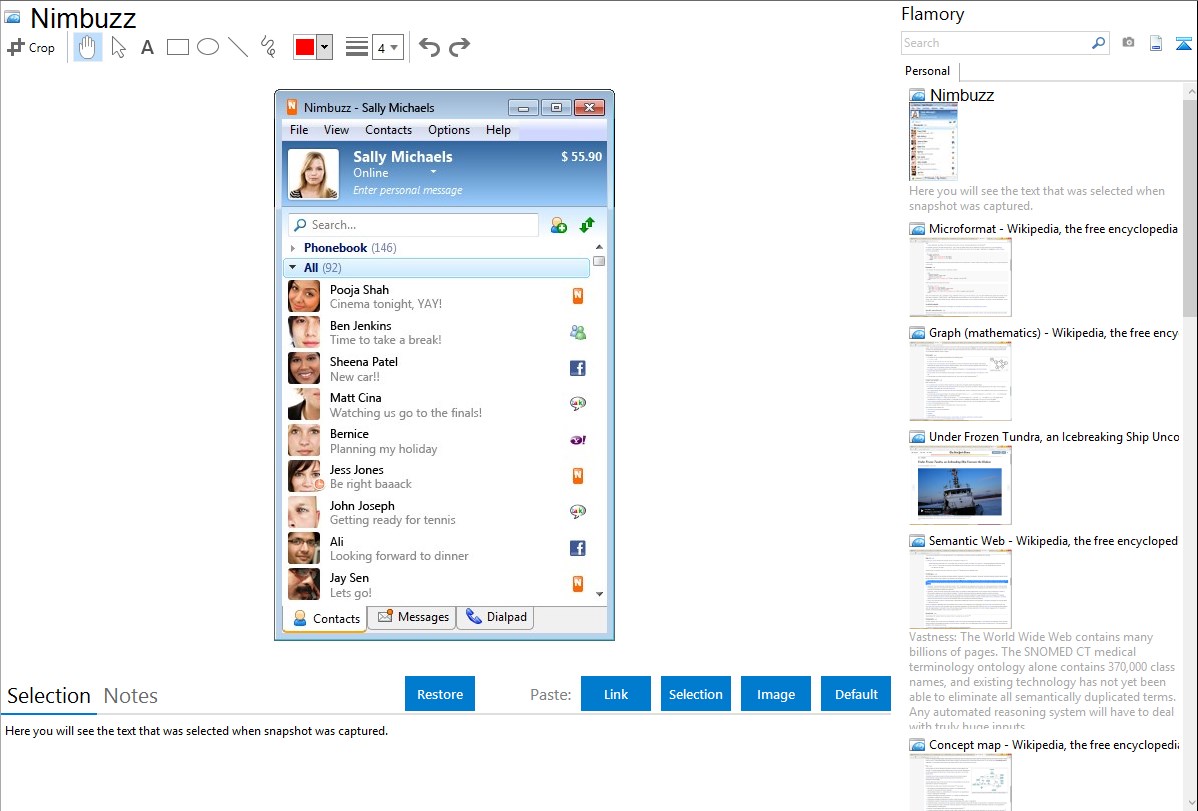 Flamory helps you capture and store screenshots from Nimbuzz by pressing a single hotkey. It will be saved to a history, so you can continue doing your tasks without interruptions. Later, you can edit the screenshot: crop, resize, add labels and highlights. After that, you can paste the screenshot into any other document or e-mail message.
