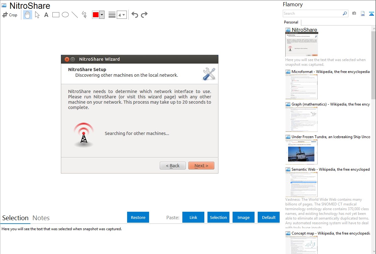Flamory helps you capture and store screenshots from NitroShare by pressing a single hotkey. It will be saved to a history, so you can continue doing your tasks without interruptions. Later, you can edit the screenshot: crop, resize, add labels and highlights. After that, you can paste the screenshot into any other document or e-mail message.