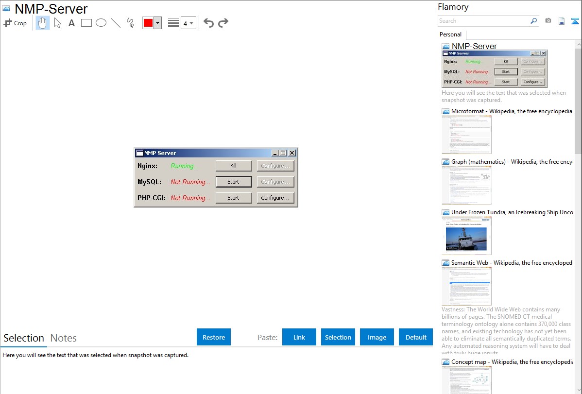 Flamory helps you capture and store screenshots from NMP-Server by pressing a single hotkey. It will be saved to a history, so you can continue doing your tasks without interruptions. Later, you can edit the screenshot: crop, resize, add labels and highlights. After that, you can paste the screenshot into any other document or e-mail message.