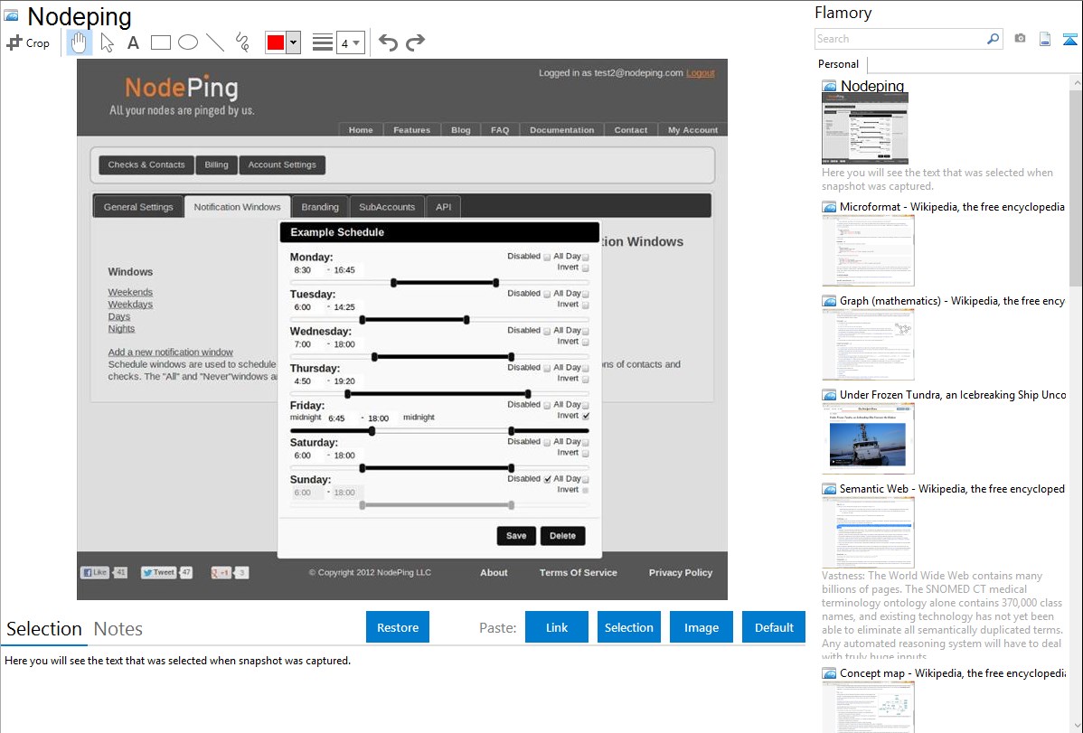 Flamory helps you capture and store screenshots from Nodeping by pressing a single hotkey. It will be saved to a history, so you can continue doing your tasks without interruptions. Later, you can edit the screenshot: crop, resize, add labels and highlights. After that, you can paste the screenshot into any other document or e-mail message.