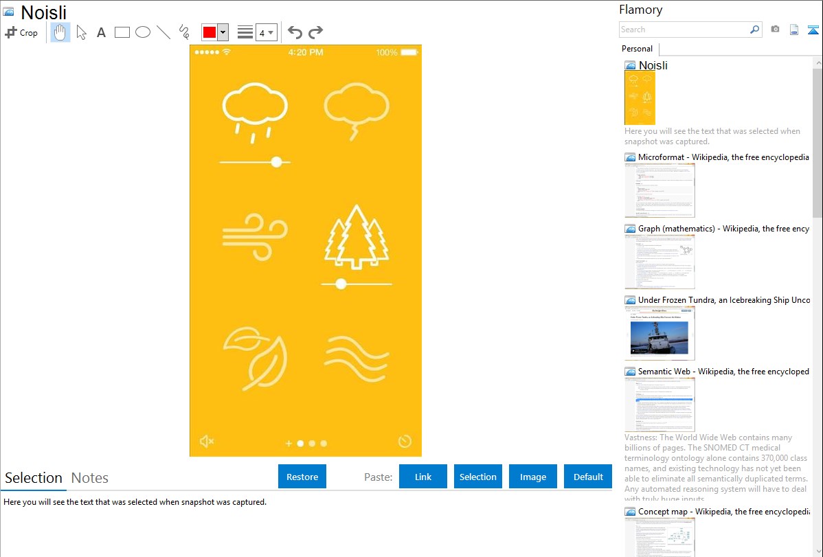 Flamory helps you capture and store screenshots from Noisli by pressing a single hotkey. It will be saved to a history, so you can continue doing your tasks without interruptions. Later, you can edit the screenshot: crop, resize, add labels and highlights. After that, you can paste the screenshot into any other document or e-mail message.