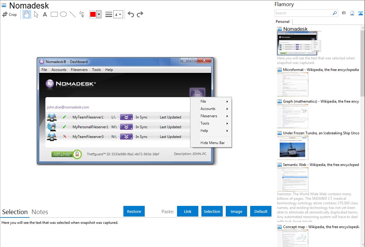 Flamory provides advanced bookmarking for Nomadesk. It captures screen, selection, text on the page and other context. You can find this bookmark later using search by page content or looking through thumbnail list.