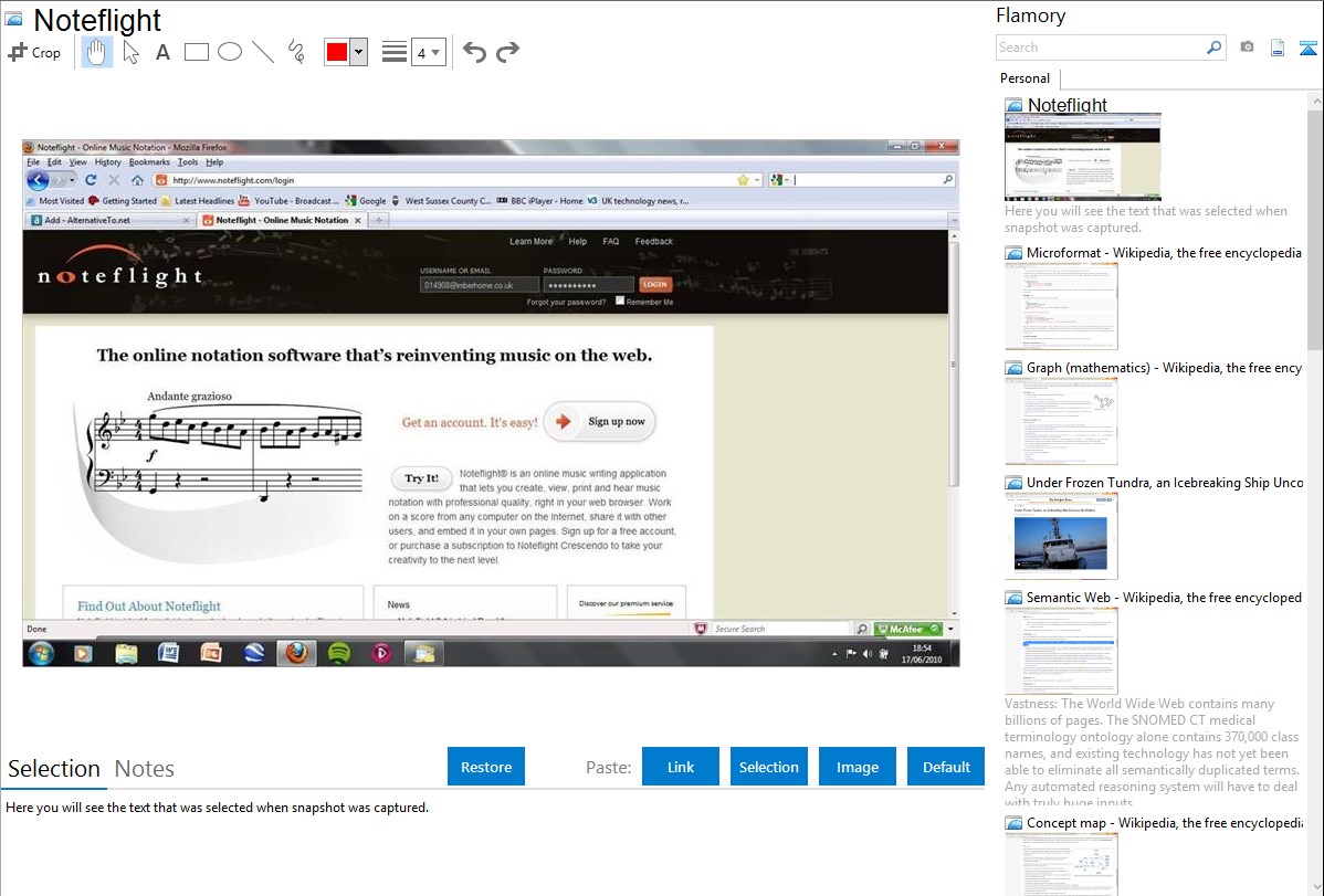 Flamory helps you capture and store screenshots from Noteflight by pressing a single hotkey. It will be saved to a history, so you can continue doing your tasks without interruptions. Later, you can edit the screenshot: crop, resize, add labels and highlights. After that, you can paste the screenshot into any other document or e-mail message.