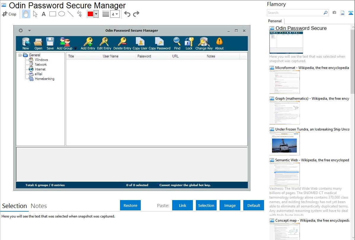 Flamory helps you capture and store screenshots from Odin Password Secure Manager by pressing a single hotkey. It will be saved to a history, so you can continue doing your tasks without interruptions. Later, you can edit the screenshot: crop, resize, add labels and highlights. After that, you can paste the screenshot into any other document or e-mail message.
