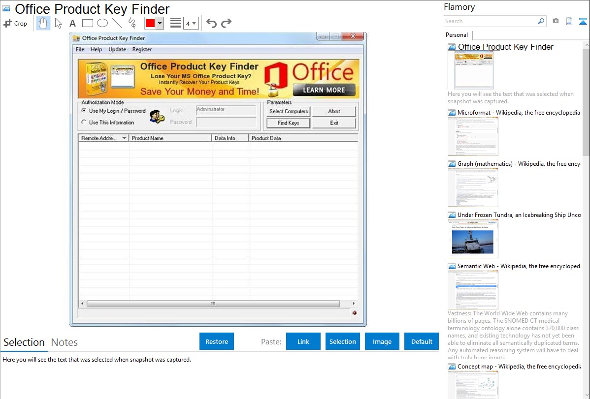 Flamory helps you capture and store screenshots from Office Product Key Finder by pressing a single hotkey. It will be saved to a history, so you can continue doing your tasks without interruptions. Later, you can edit the screenshot: crop, resize, add labels and highlights. After that, you can paste the screenshot into any other document or e-mail message.