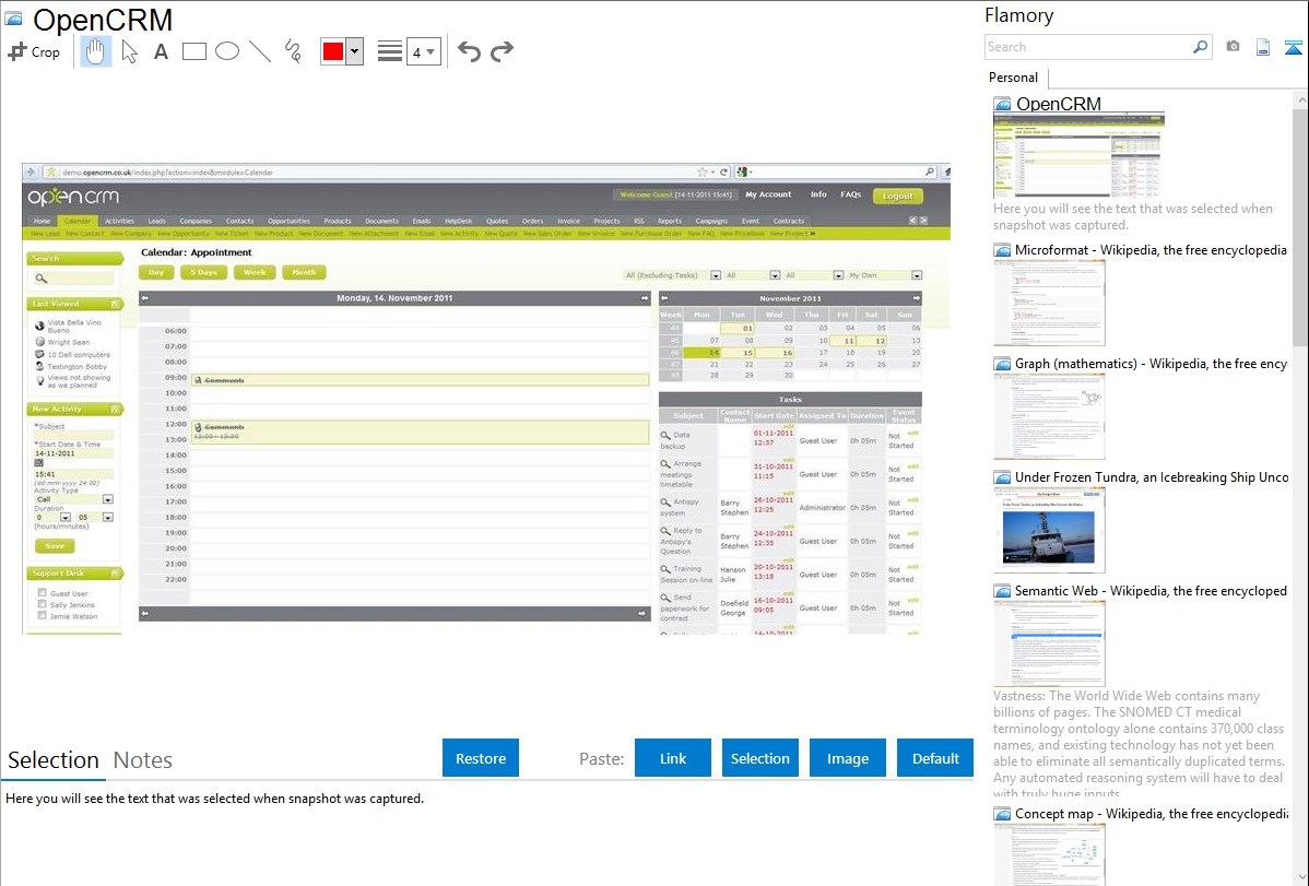 Flamory helps you capture and store screenshots from OpenCRM by pressing a single hotkey. It will be saved to a history, so you can continue doing your tasks without interruptions. Later, you can edit the screenshot: crop, resize, add labels and highlights. After that, you can paste the screenshot into any other document or e-mail message.