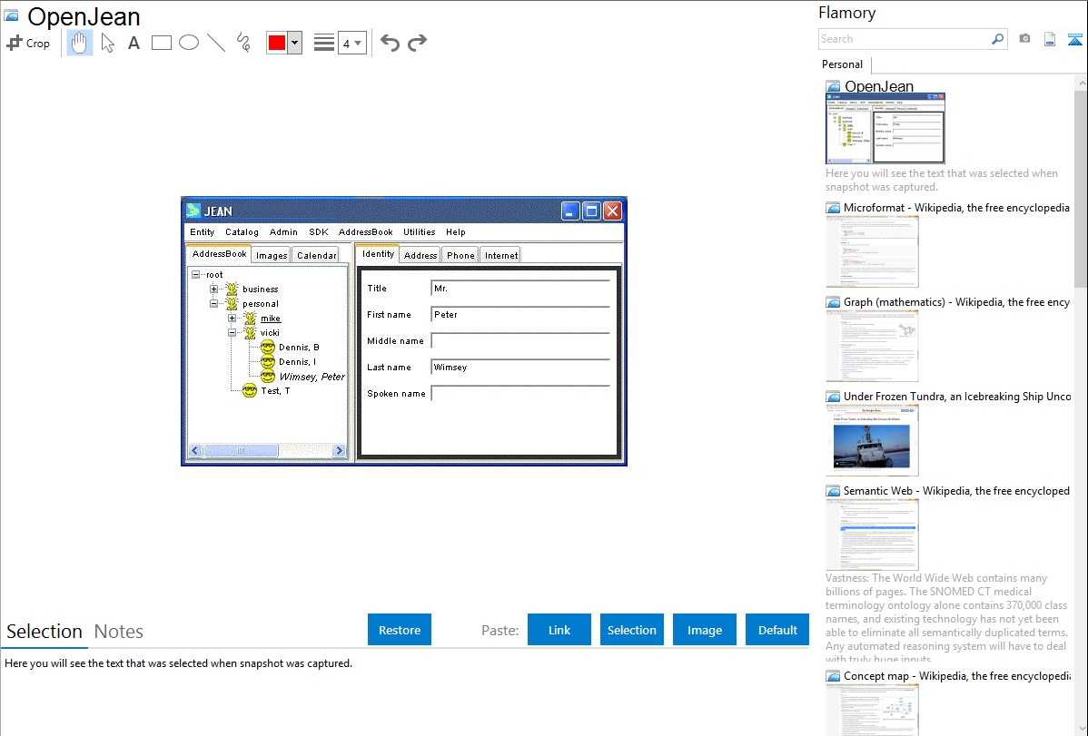 Flamory helps you capture and store screenshots from OpenJean by pressing a single hotkey. It will be saved to a history, so you can continue doing your tasks without interruptions. Later, you can edit the screenshot: crop, resize, add labels and highlights. After that, you can paste the screenshot into any other document or e-mail message.