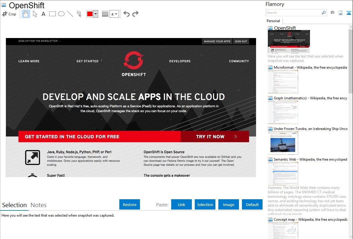 Flamory helps you capture and store screenshots from OpenShift by pressing a single hotkey. It will be saved to a history, so you can continue doing your tasks without interruptions. Later, you can edit the screenshot: crop, resize, add labels and highlights. After that, you can paste the screenshot into any other document or e-mail message.