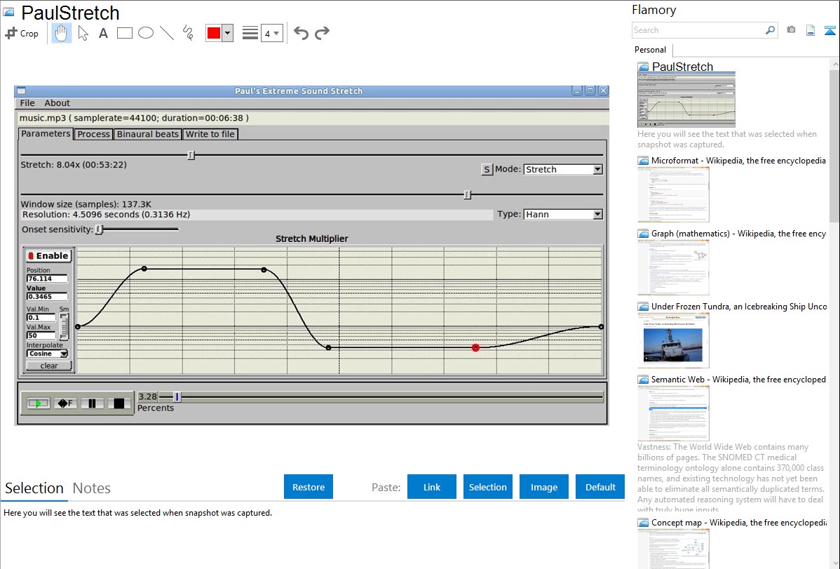 Flamory helps you capture and store screenshots from PaulStretch by pressing a single hotkey. It will be saved to a history, so you can continue doing your tasks without interruptions. Later, you can edit the screenshot: crop, resize, add labels and highlights. After that, you can paste the screenshot into any other document or e-mail message.