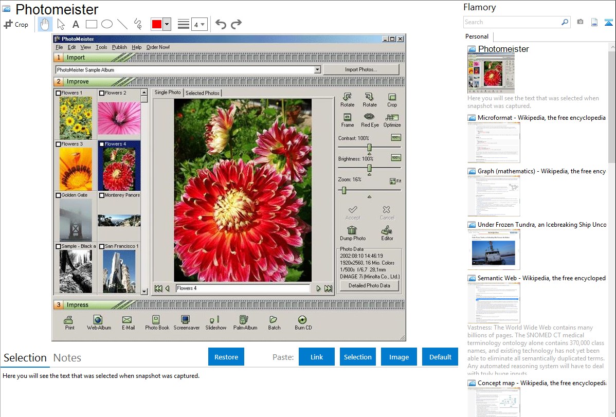 Flamory helps you capture and store screenshots from Photomeister by pressing a single hotkey. It will be saved to a history, so you can continue doing your tasks without interruptions. Later, you can edit the screenshot: crop, resize, add labels and highlights. After that, you can paste the screenshot into any other document or e-mail message.