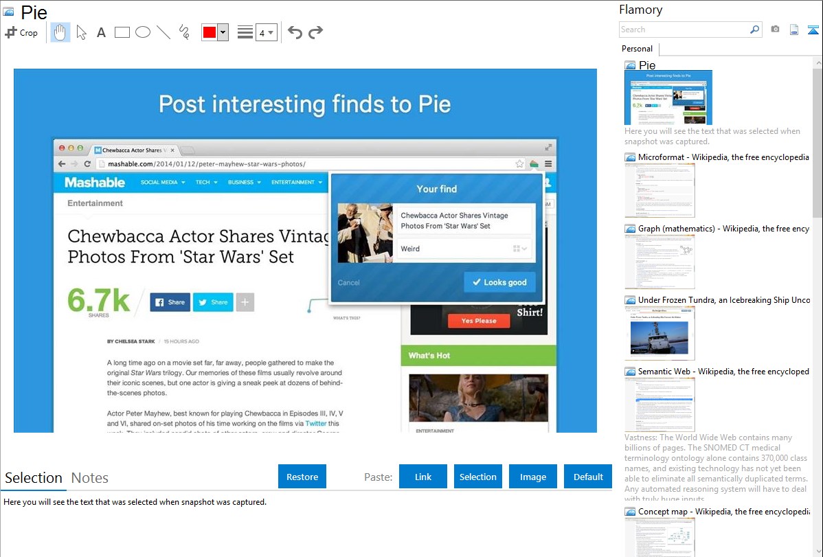 Flamory helps you capture and store screenshots from Pie by pressing a single hotkey. It will be saved to a history, so you can continue doing your tasks without interruptions. Later, you can edit the screenshot: crop, resize, add labels and highlights. After that, you can paste the screenshot into any other document or e-mail message.