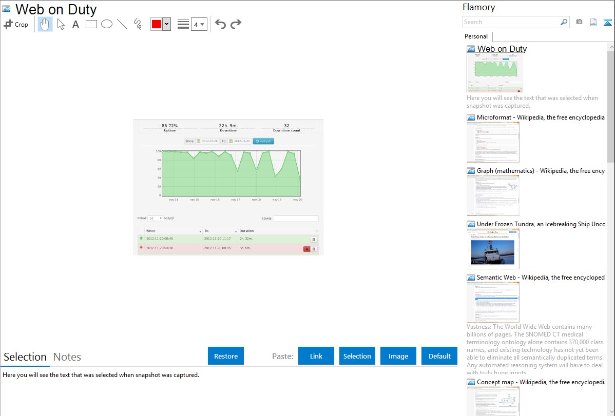 Flamory helps you capture and store screenshots from Web on Duty by pressing a single hotkey. It will be saved to a history, so you can continue doing your tasks without interruptions. Later, you can edit the screenshot: crop, resize, add labels and highlights. After that, you can paste the screenshot into any other document or e-mail message.
