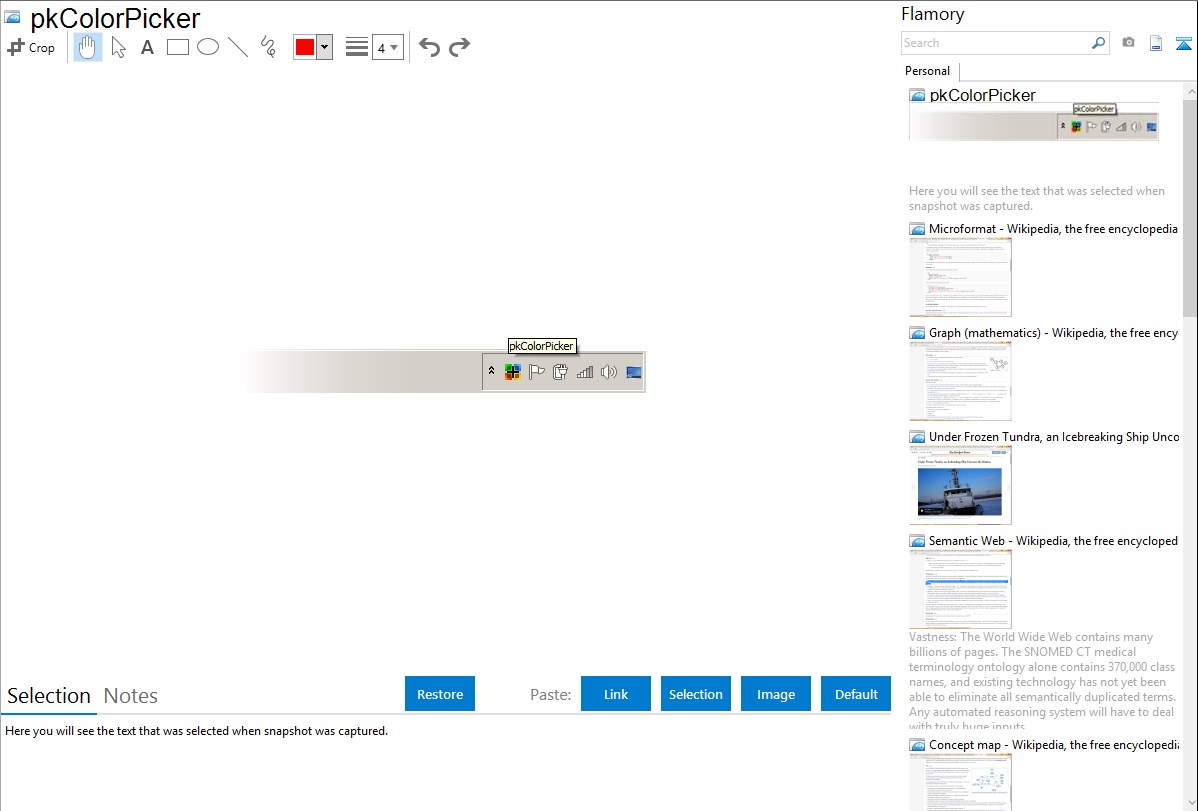Flamory helps you capture and store screenshots from pkColorPicker by pressing a single hotkey. It will be saved to a history, so you can continue doing your tasks without interruptions. Later, you can edit the screenshot: crop, resize, add labels and highlights. After that, you can paste the screenshot into any other document or e-mail message.