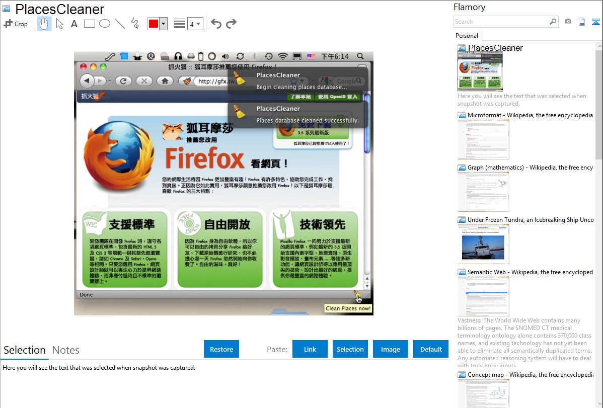 Flamory helps you capture and store screenshots from PlacesCleaner by pressing a single hotkey. It will be saved to a history, so you can continue doing your tasks without interruptions. Later, you can edit the screenshot: crop, resize, add labels and highlights. After that, you can paste the screenshot into any other document or e-mail message.
