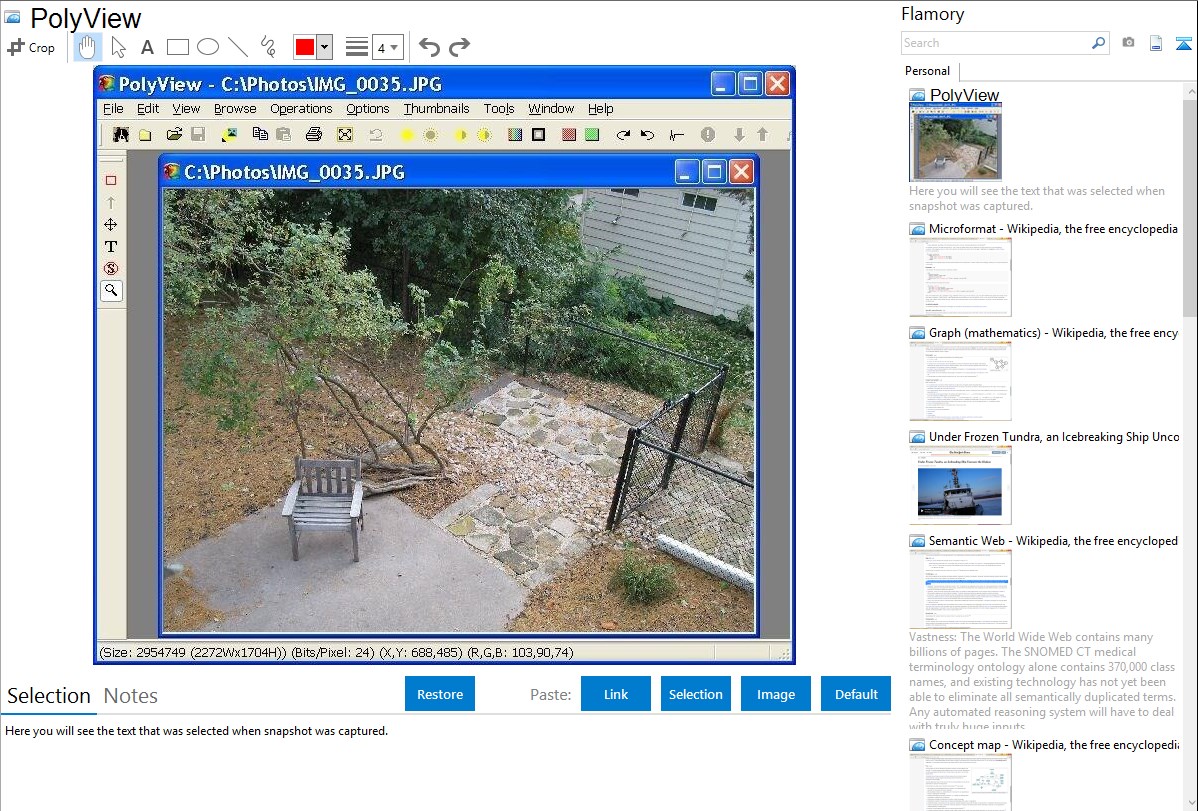 Flamory helps you capture and store screenshots from PolyView by pressing a single hotkey. It will be saved to a history, so you can continue doing your tasks without interruptions. Later, you can edit the screenshot: crop, resize, add labels and highlights. After that, you can paste the screenshot into any other document or e-mail message.