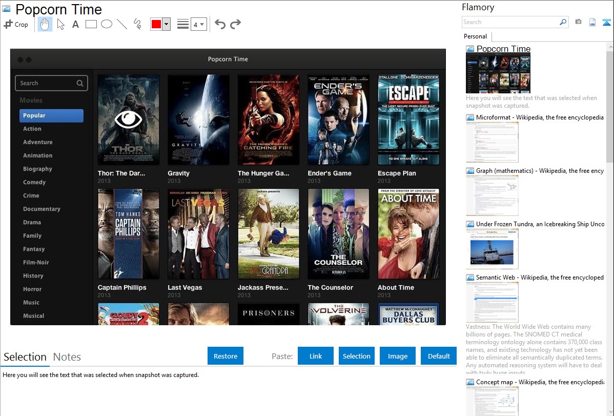 Flamory helps you capture and store screenshots from Popcorn Time by pressing a single hotkey. It will be saved to a history, so you can continue doing your tasks without interruptions. Later, you can edit the screenshot: crop, resize, add labels and highlights. After that, you can paste the screenshot into any other document or e-mail message.