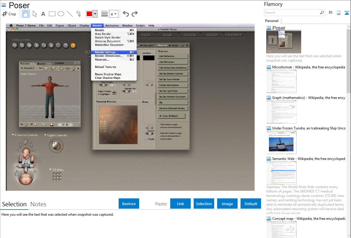 Flamory helps you capture and store screenshots from Poser by pressing a single hotkey. It will be saved to a history, so you can continue doing your tasks without interruptions. Later, you can edit the screenshot: crop, resize, add labels and highlights. After that, you can paste the screenshot into any other document or e-mail message.