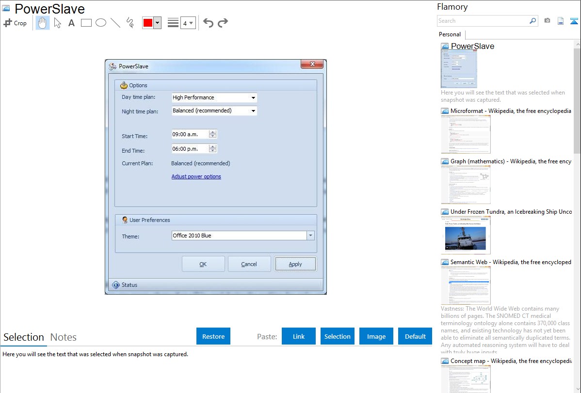 Flamory helps you capture and store screenshots from PowerSlave by pressing a single hotkey. It will be saved to a history, so you can continue doing your tasks without interruptions. Later, you can edit the screenshot: crop, resize, add labels and highlights. After that, you can paste the screenshot into any other document or e-mail message.