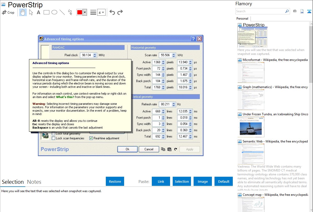Flamory helps you capture and store screenshots from PowerStrip by pressing a single hotkey. It will be saved to a history, so you can continue doing your tasks without interruptions. Later, you can edit the screenshot: crop, resize, add labels and highlights. After that, you can paste the screenshot into any other document or e-mail message.