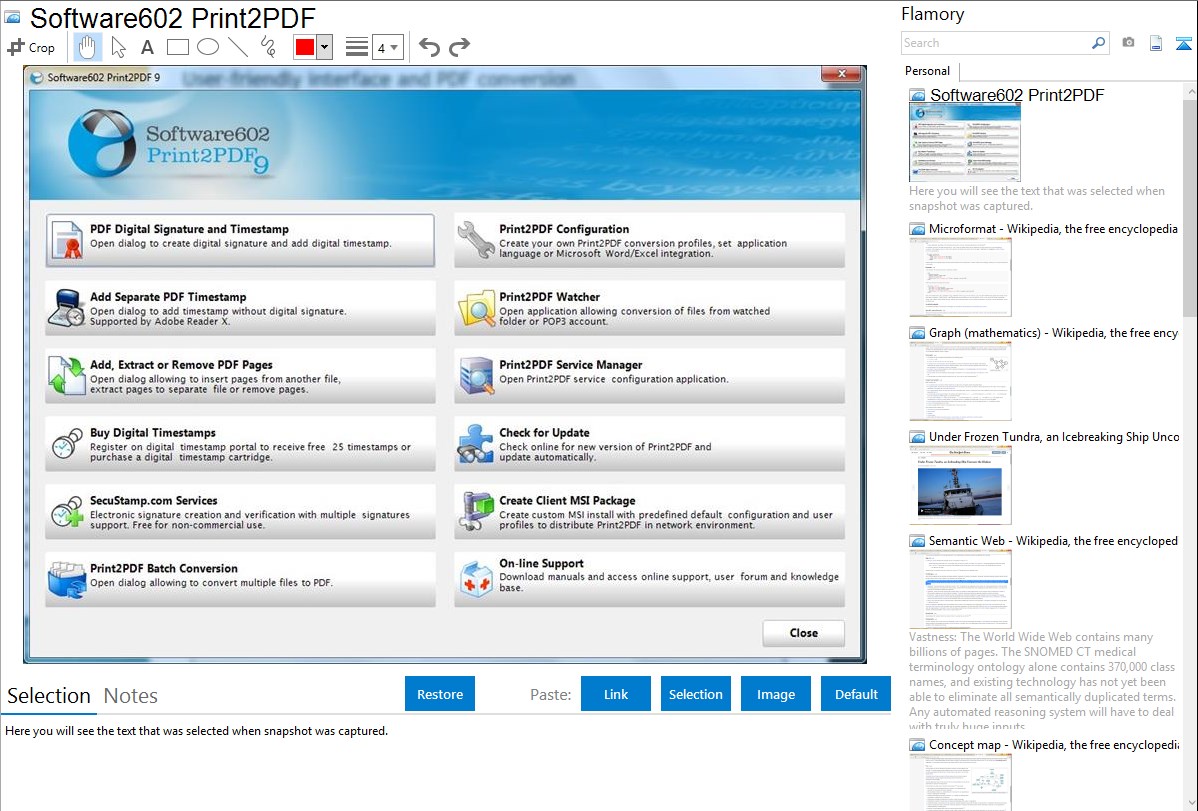 Flamory helps you capture and store screenshots from Software602 Print2PDF by pressing a single hotkey. It will be saved to a history, so you can continue doing your tasks without interruptions. Later, you can edit the screenshot: crop, resize, add labels and highlights. After that, you can paste the screenshot into any other document or e-mail message.
