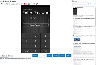 Flamory helps you capture and store screenshots from Private Photo by pressing a single hotkey. It will be saved to a history, so you can continue doing your tasks without interruptions. Later, you can edit the screenshot: crop, resize, add labels and highlights. After that, you can paste the screenshot into any other document or e-mail message.