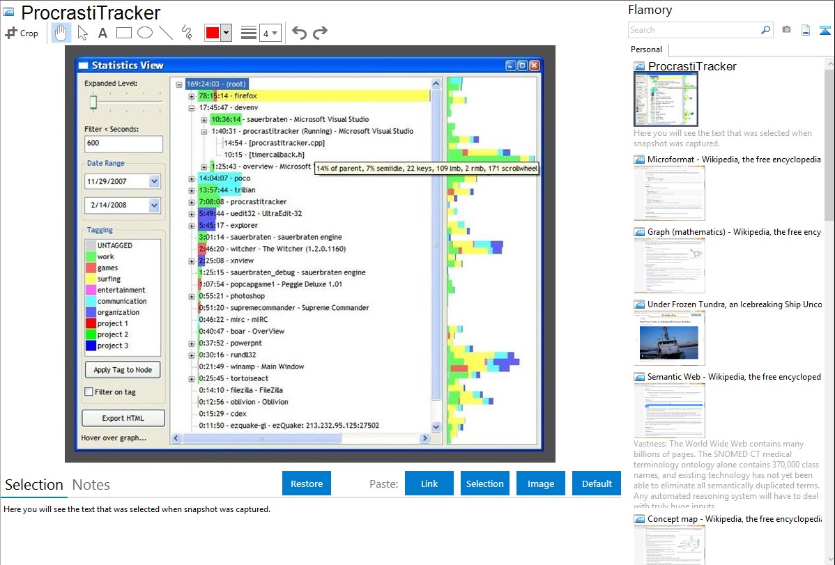 Flamory helps you capture and store screenshots from ProcrastiTracker by pressing a single hotkey. It will be saved to a history, so you can continue doing your tasks without interruptions. Later, you can edit the screenshot: crop, resize, add labels and highlights. After that, you can paste the screenshot into any other document or e-mail message.