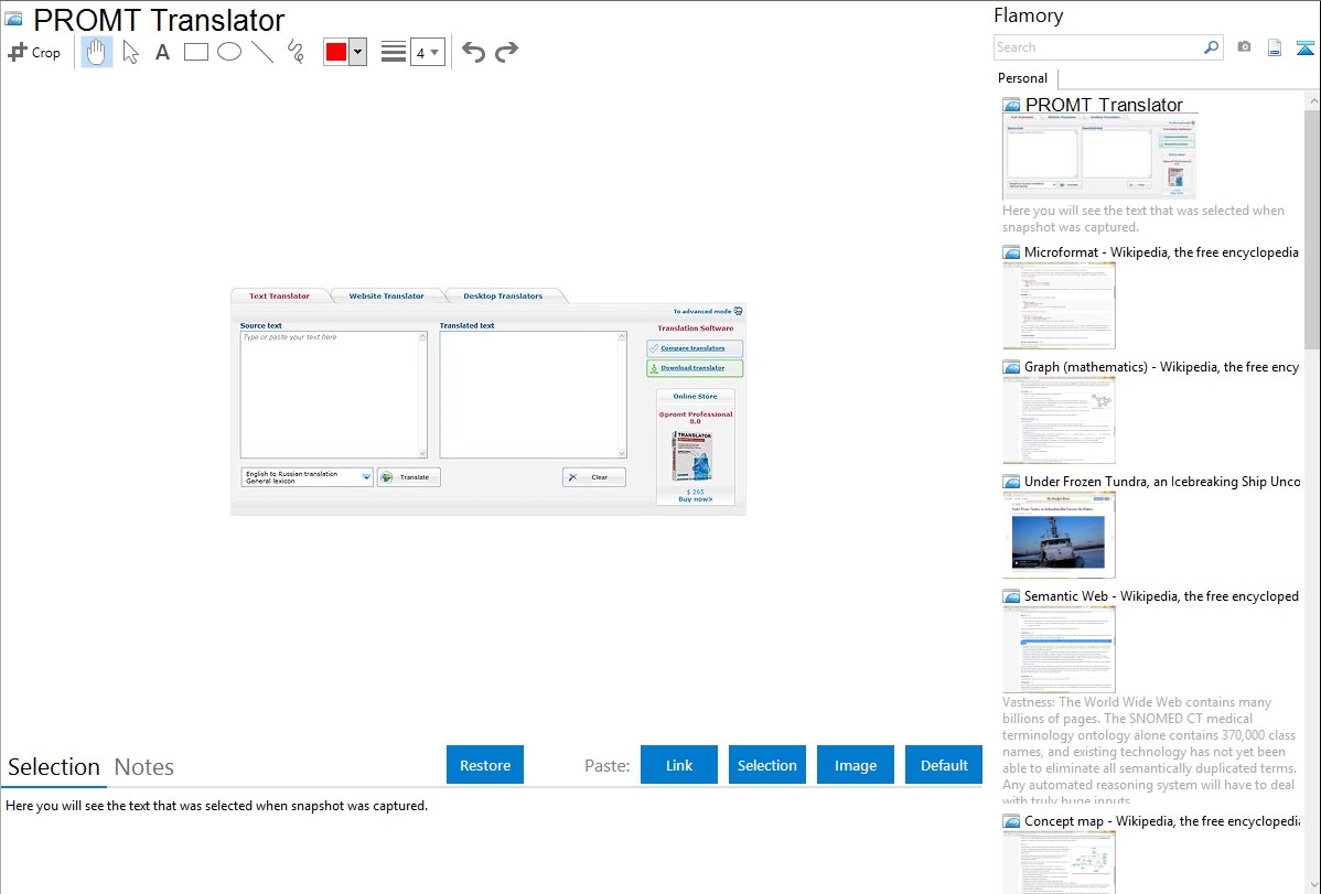 Flamory helps you capture and store screenshots from PROMT Translator by pressing a single hotkey. It will be saved to a history, so you can continue doing your tasks without interruptions. Later, you can edit the screenshot: crop, resize, add labels and highlights. After that, you can paste the screenshot into any other document or e-mail message.