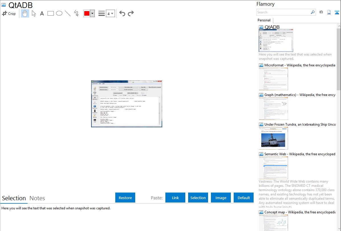 Flamory helps you capture and store screenshots from QtADB by pressing a single hotkey. It will be saved to a history, so you can continue doing your tasks without interruptions. Later, you can edit the screenshot: crop, resize, add labels and highlights. After that, you can paste the screenshot into any other document or e-mail message.