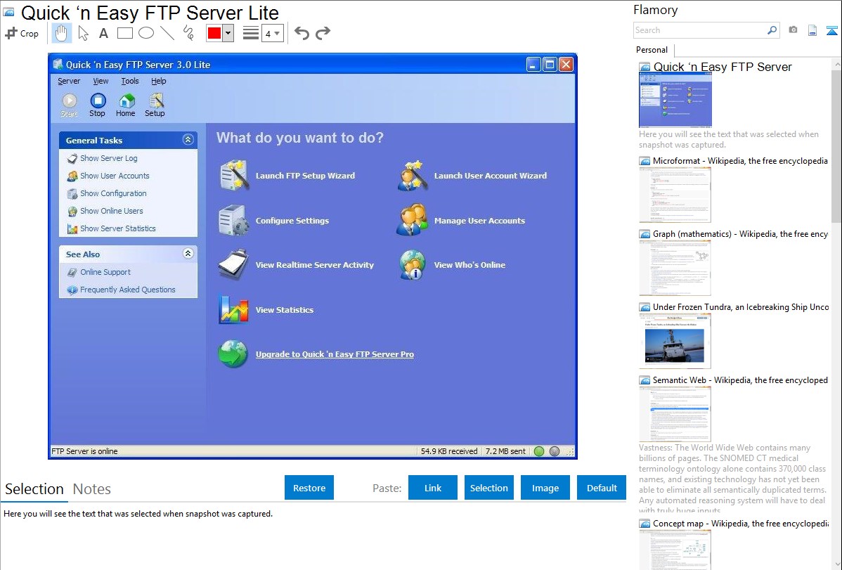 Flamory helps you capture and store screenshots from Quick ‘n Easy FTP Server Lite by pressing a single hotkey. It will be saved to a history, so you can continue doing your tasks without interruptions. Later, you can edit the screenshot: crop, resize, add labels and highlights. After that, you can paste the screenshot into any other document or e-mail message.