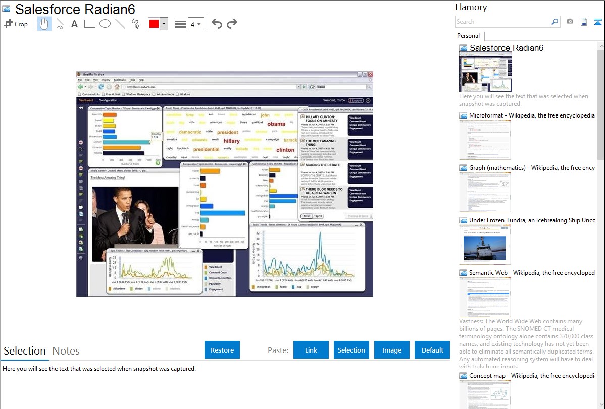 Flamory helps you capture and store screenshots from Salesforce Radian6 by pressing a single hotkey. It will be saved to a history, so you can continue doing your tasks without interruptions. Later, you can edit the screenshot: crop, resize, add labels and highlights. After that, you can paste the screenshot into any other document or e-mail message.