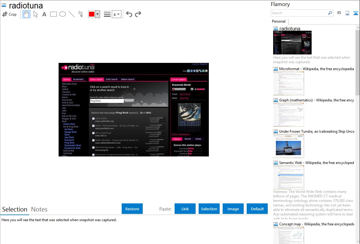 Flamory helps you capture and store screenshots from radiotuna by pressing a single hotkey. It will be saved to a history, so you can continue doing your tasks without interruptions. Later, you can edit the screenshot: crop, resize, add labels and highlights. After that, you can paste the screenshot into any other document or e-mail message.
