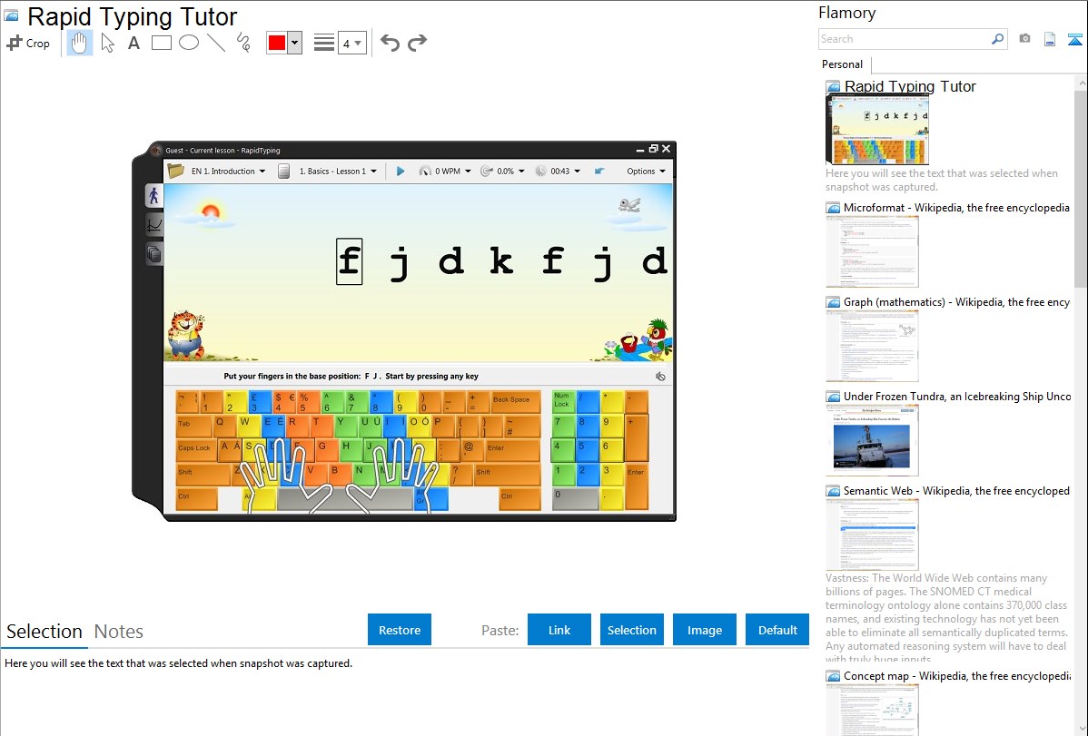 Flamory helps you capture and store screenshots from Rapid Typing Tutor by pressing a single hotkey. It will be saved to a history, so you can continue doing your tasks without interruptions. Later, you can edit the screenshot: crop, resize, add labels and highlights. After that, you can paste the screenshot into any other document or e-mail message.