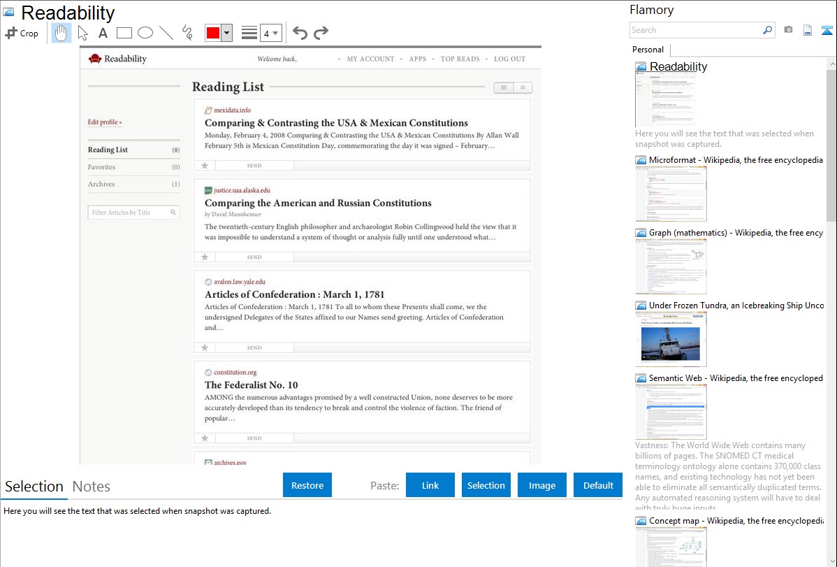 Flamory helps you capture and store screenshots from Readability by pressing a single hotkey. It will be saved to a history, so you can continue doing your tasks without interruptions. Later, you can edit the screenshot: crop, resize, add labels and highlights. After that, you can paste the screenshot into any other document or e-mail message.