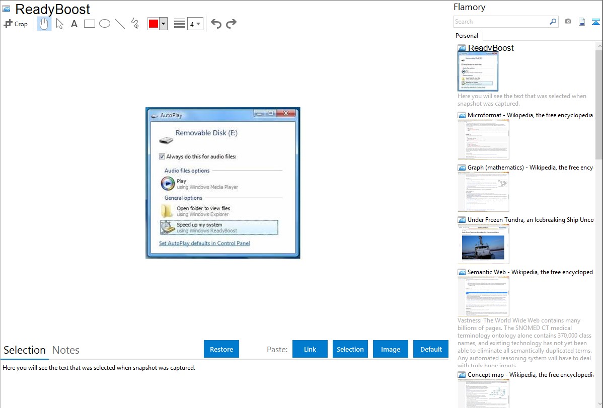 Flamory helps you capture and store screenshots from ReadyBoost by pressing a single hotkey. It will be saved to a history, so you can continue doing your tasks without interruptions. Later, you can edit the screenshot: crop, resize, add labels and highlights. After that, you can paste the screenshot into any other document or e-mail message.