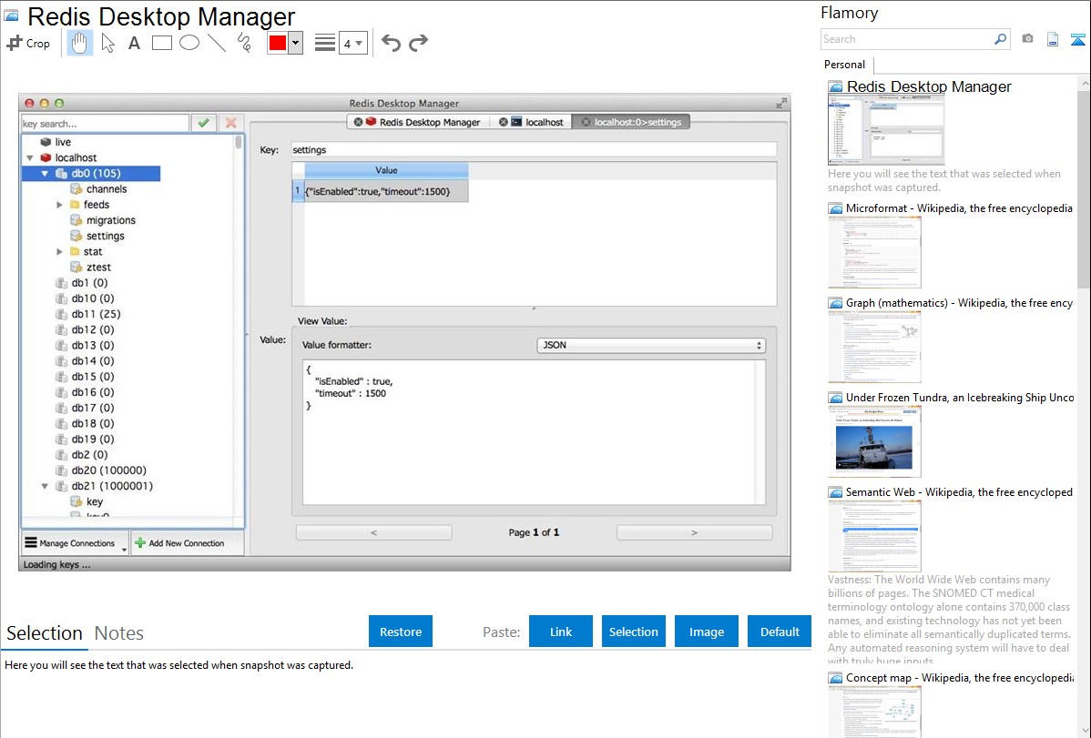 Flamory helps you capture and store screenshots from Redis Desktop Manager by pressing a single hotkey. It will be saved to a history, so you can continue doing your tasks without interruptions. Later, you can edit the screenshot: crop, resize, add labels and highlights. After that, you can paste the screenshot into any other document or e-mail message.