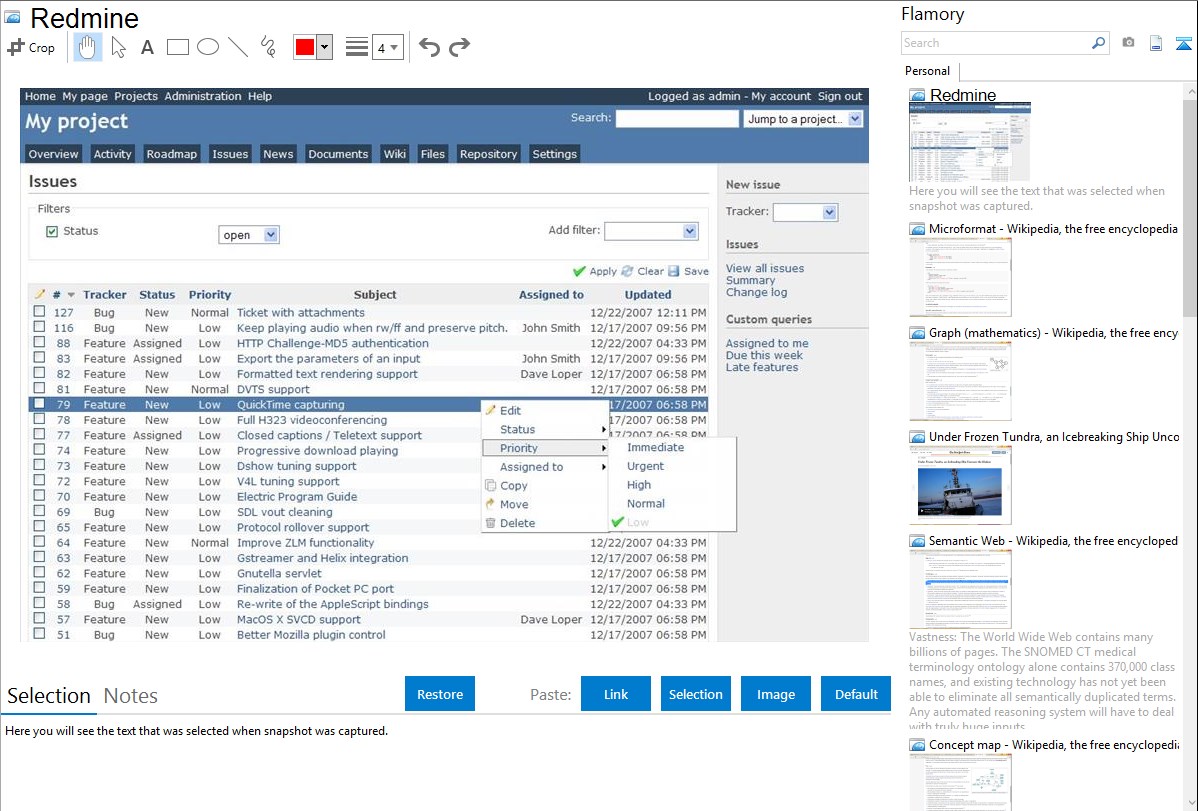 Flamory helps you capture and store screenshots from Redmine by pressing a single hotkey. It will be saved to a history, so you can continue doing your tasks without interruptions. Later, you can edit the screenshot: crop, resize, add labels and highlights. After that, you can paste the screenshot into any other document or e-mail message.