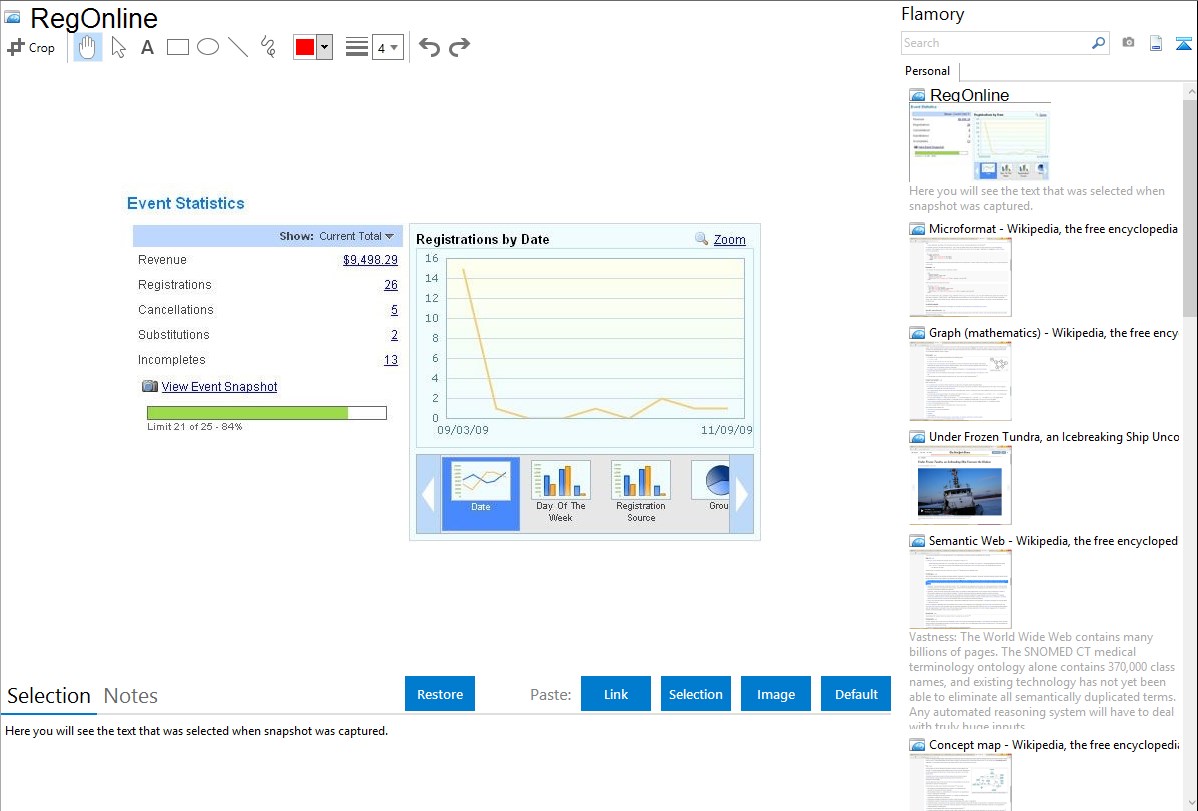 Flamory helps you capture and store screenshots from RegOnline by pressing a single hotkey. It will be saved to a history, so you can continue doing your tasks without interruptions. Later, you can edit the screenshot: crop, resize, add labels and highlights. After that, you can paste the screenshot into any other document or e-mail message.
