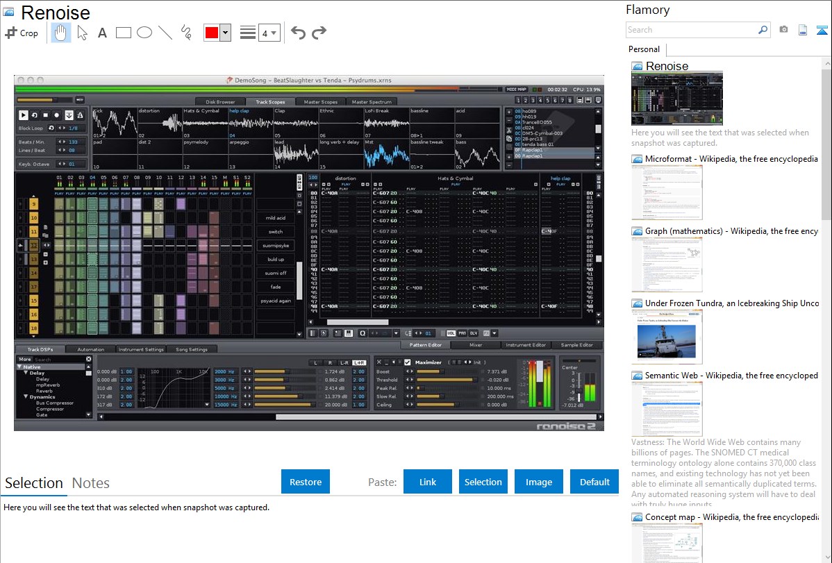 Flamory helps you capture and store screenshots from Renoise by pressing a single hotkey. It will be saved to a history, so you can continue doing your tasks without interruptions. Later, you can edit the screenshot: crop, resize, add labels and highlights. After that, you can paste the screenshot into any other document or e-mail message.
