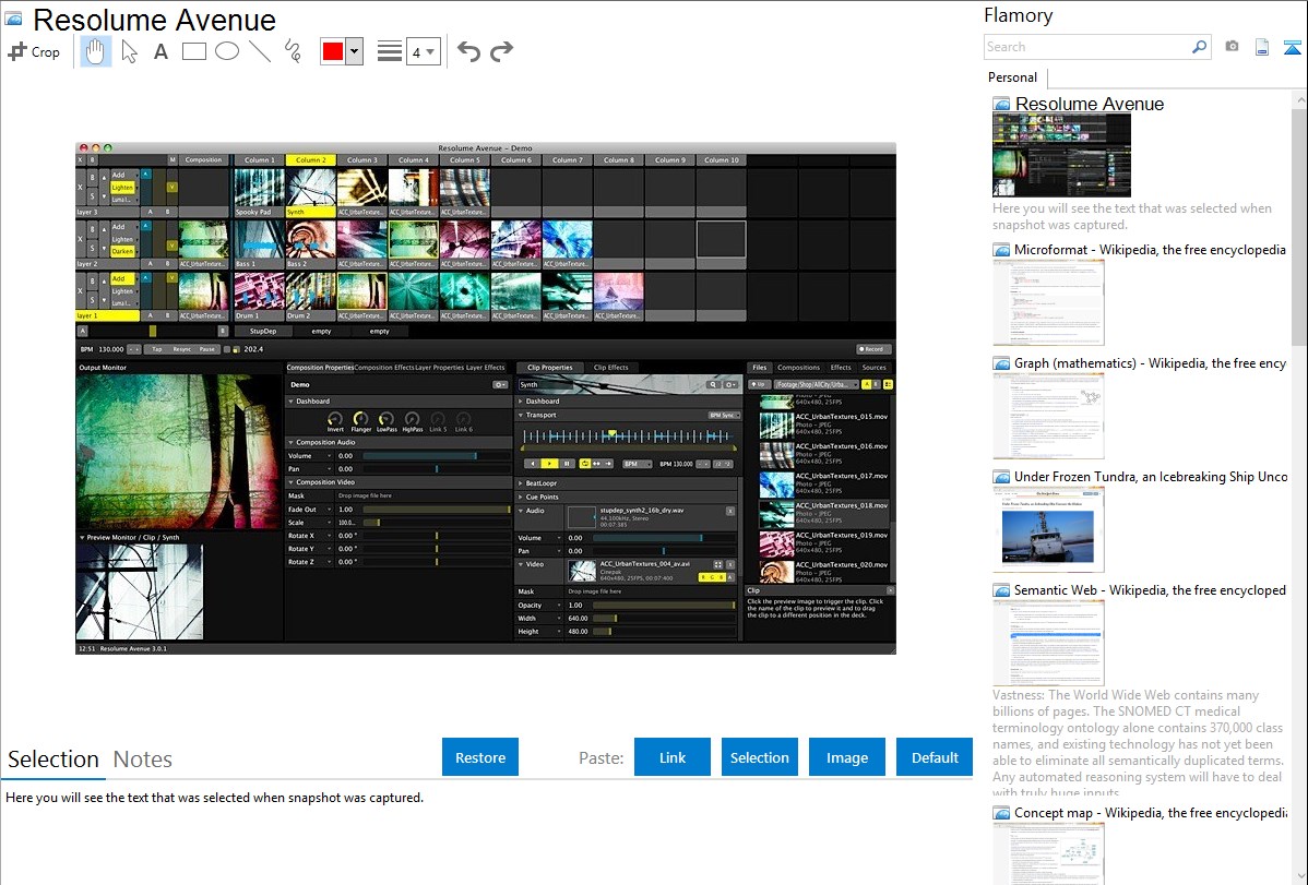 Flamory helps you capture and store screenshots from Resolume Avenue by pressing a single hotkey. It will be saved to a history, so you can continue doing your tasks without interruptions. Later, you can edit the screenshot: crop, resize, add labels and highlights. After that, you can paste the screenshot into any other document or e-mail message.