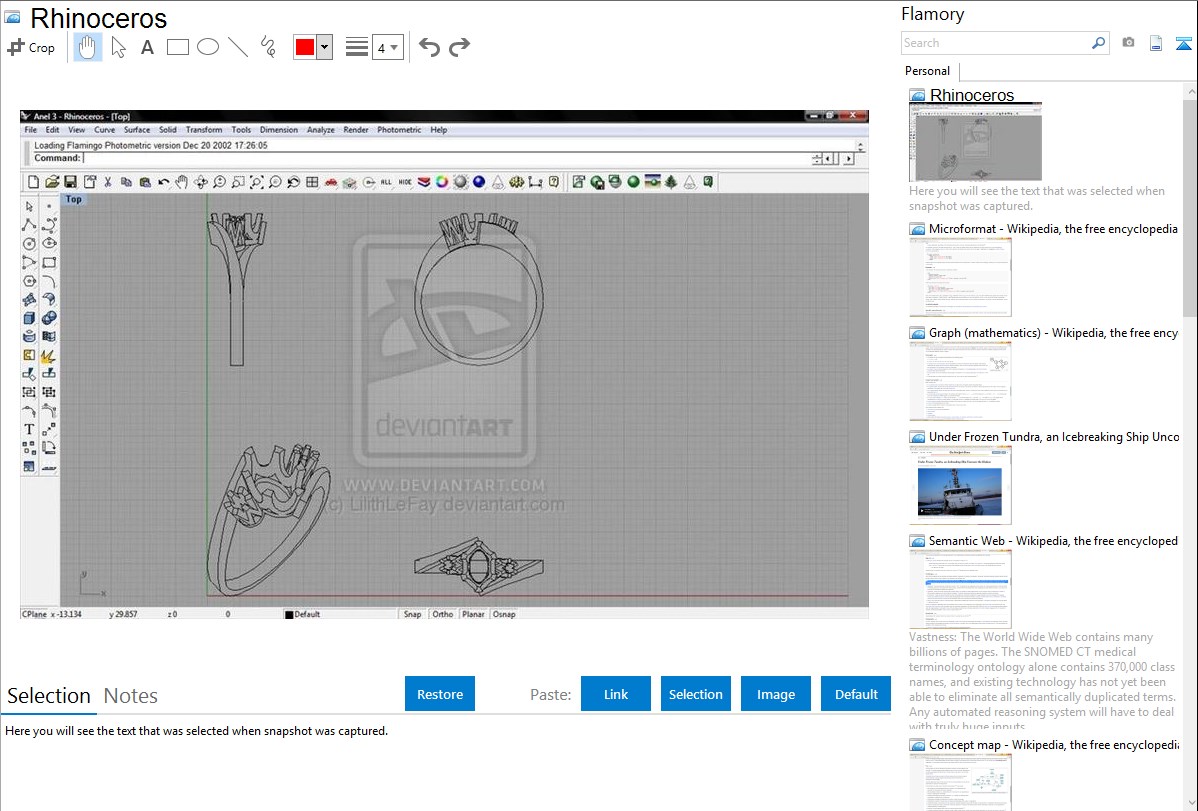Flamory helps you capture and store screenshots from Rhinoceros by pressing a single hotkey. It will be saved to a history, so you can continue doing your tasks without interruptions. Later, you can edit the screenshot: crop, resize, add labels and highlights. After that, you can paste the screenshot into any other document or e-mail message.