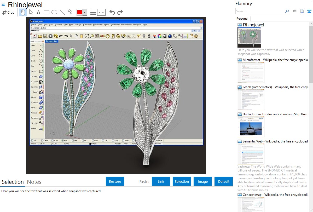 Flamory helps you capture and store screenshots from Rhinojewel by pressing a single hotkey. It will be saved to a history, so you can continue doing your tasks without interruptions. Later, you can edit the screenshot: crop, resize, add labels and highlights. After that, you can paste the screenshot into any other document or e-mail message.
