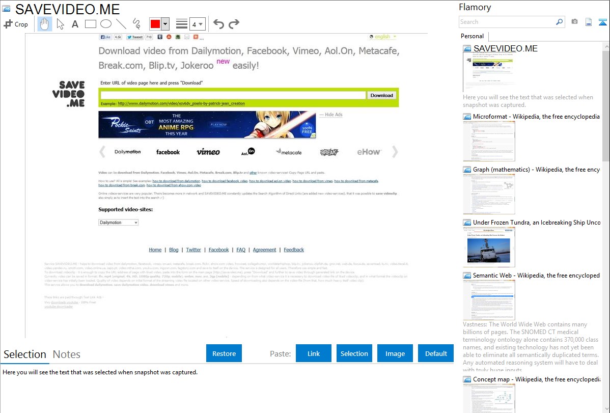 Flamory helps you capture and store screenshots from SAVEVIDEO.ME by pressing a single hotkey. It will be saved to a history, so you can continue doing your tasks without interruptions. Later, you can edit the screenshot: crop, resize, add labels and highlights. After that, you can paste the screenshot into any other document or e-mail message.