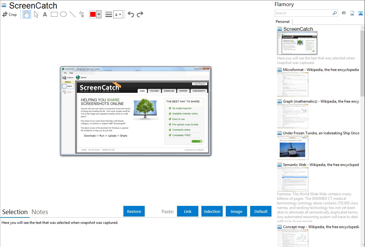 Flamory helps you capture and store screenshots from ScreenCatch by pressing a single hotkey. It will be saved to a history, so you can continue doing your tasks without interruptions. Later, you can edit the screenshot: crop, resize, add labels and highlights. After that, you can paste the screenshot into any other document or e-mail message.