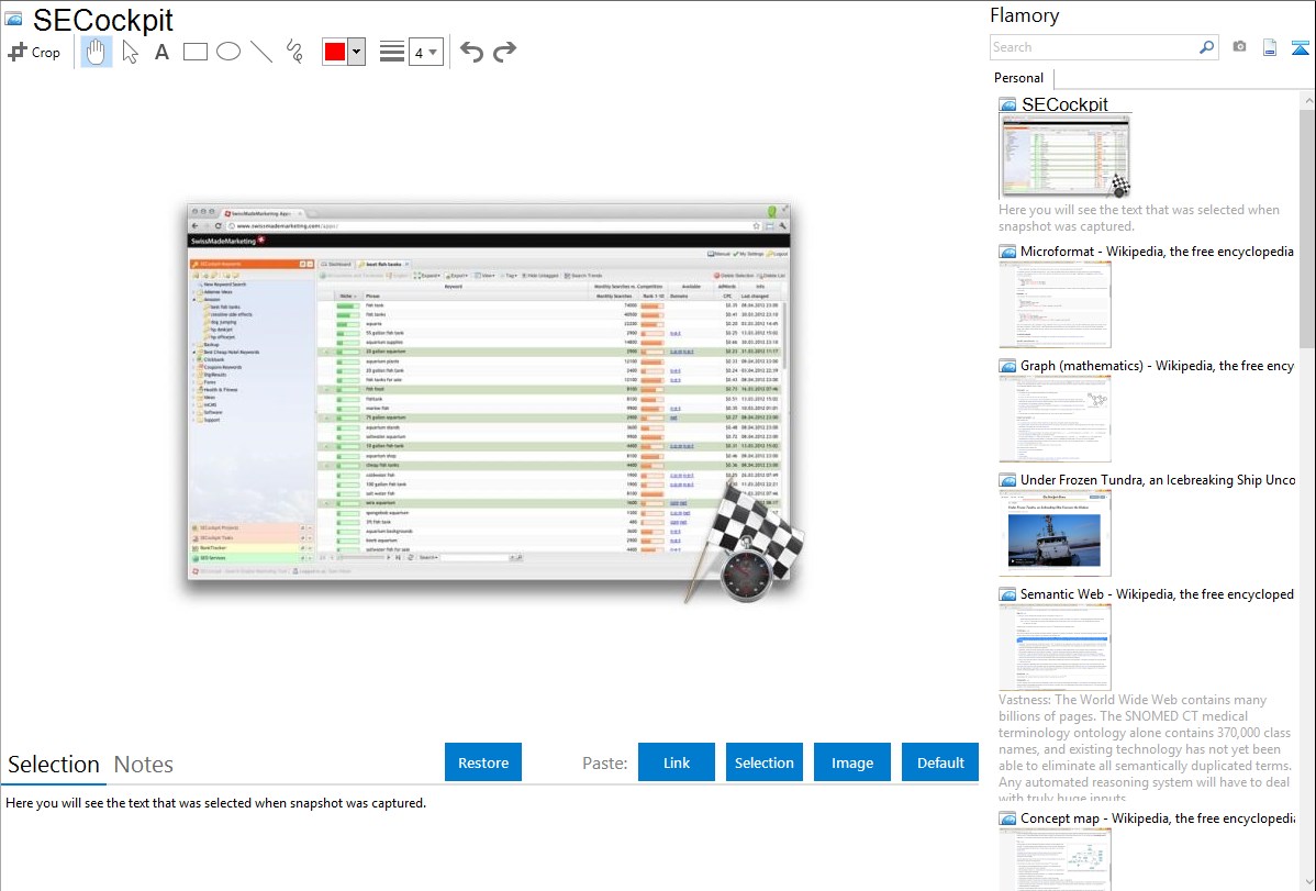 Flamory provides advanced bookmarking for SECockpit. It captures screen, selection, text on the page and other context. You can find this bookmark later using search by page content or looking through thumbnail list.