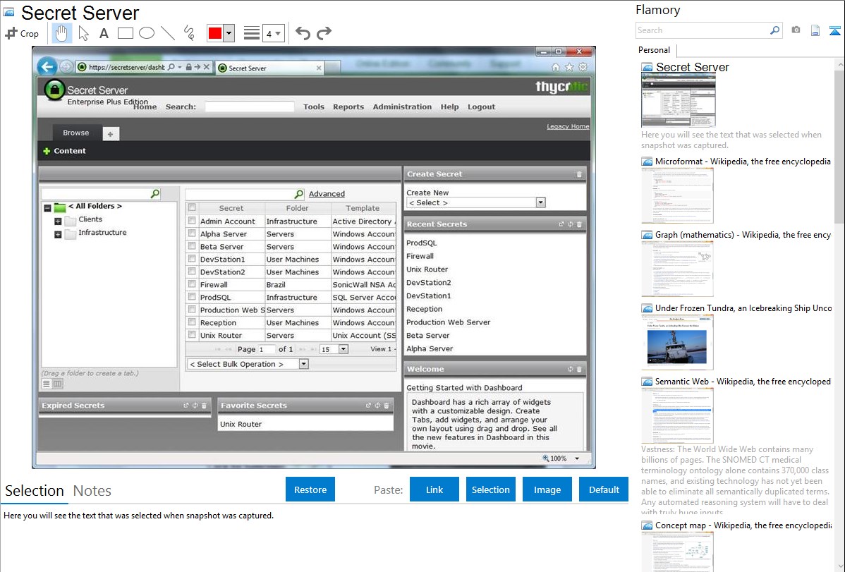 Flamory helps you capture and store screenshots from Secret Server by pressing a single hotkey. It will be saved to a history, so you can continue doing your tasks without interruptions. Later, you can edit the screenshot: crop, resize, add labels and highlights. After that, you can paste the screenshot into any other document or e-mail message.
