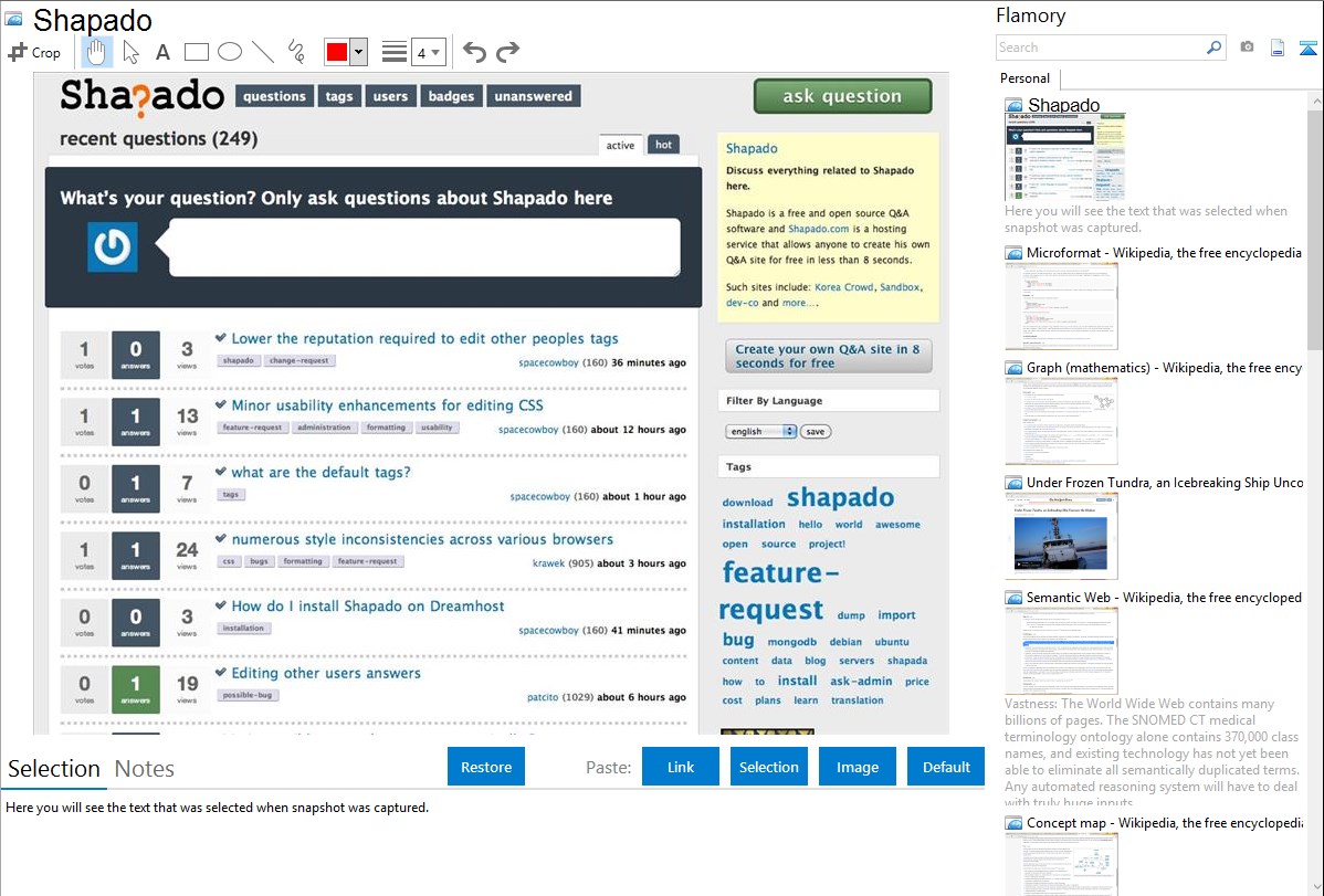 Flamory helps you capture and store screenshots from Shapado by pressing a single hotkey. It will be saved to a history, so you can continue doing your tasks without interruptions. Later, you can edit the screenshot: crop, resize, add labels and highlights. After that, you can paste the screenshot into any other document or e-mail message.