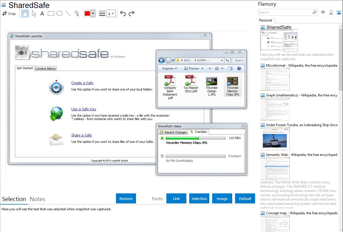 Flamory helps you capture and store screenshots from SharedSafe by pressing a single hotkey. It will be saved to a history, so you can continue doing your tasks without interruptions. Later, you can edit the screenshot: crop, resize, add labels and highlights. After that, you can paste the screenshot into any other document or e-mail message.