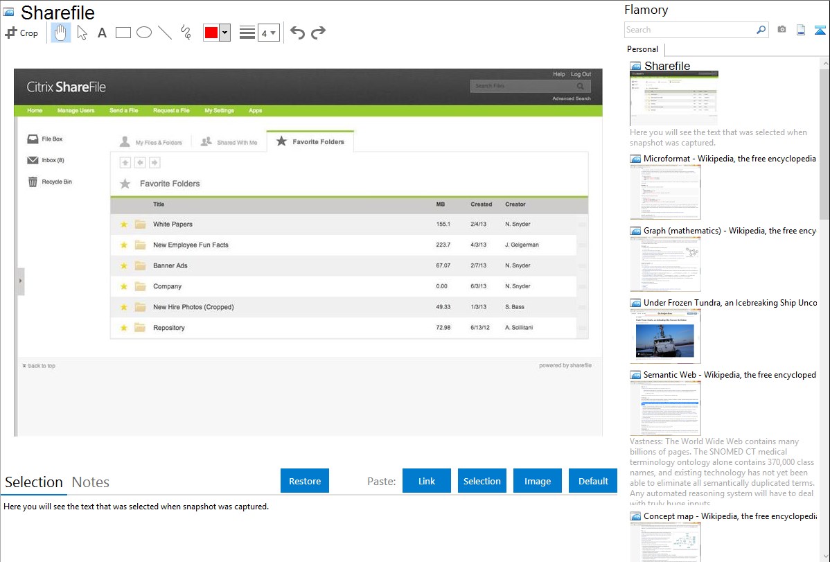Flamory provides advanced bookmarking for Sharefile. It captures screen, selection, text on the page and other context. You can find this bookmark later using search by page content or looking through thumbnail list.