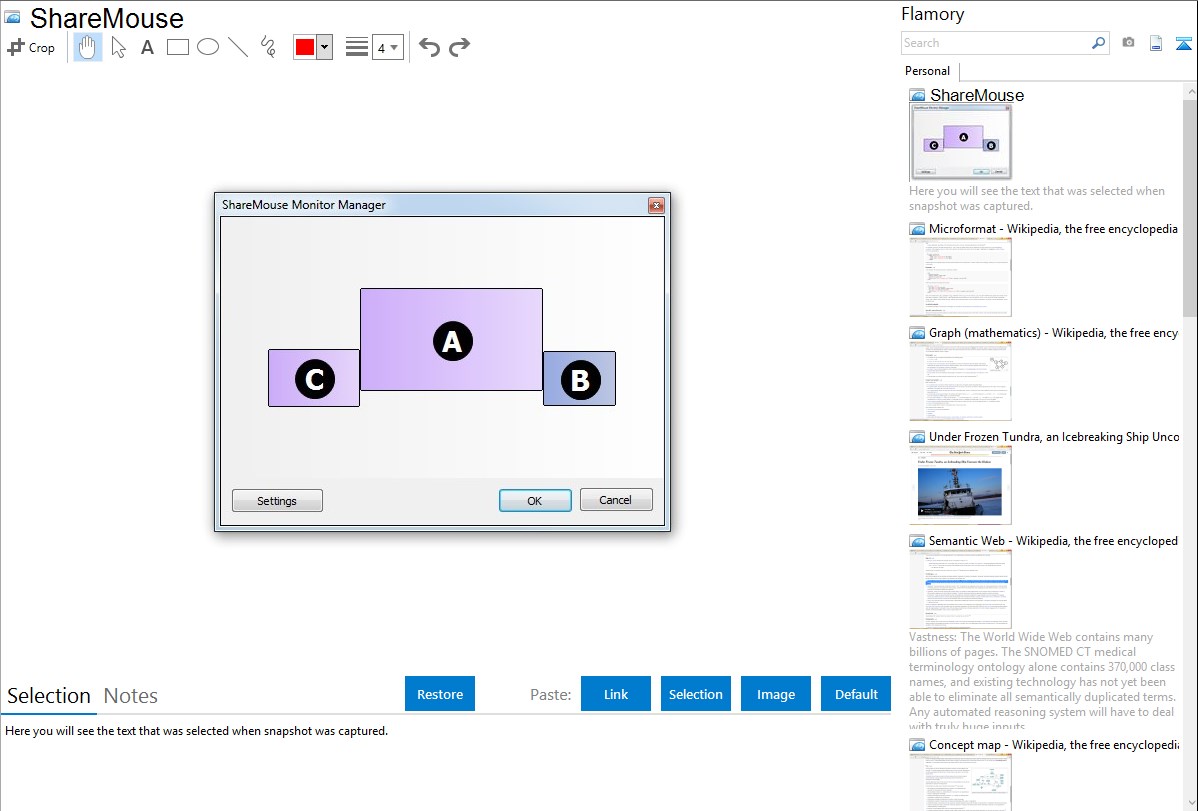 Flamory helps you capture and store screenshots from ShareMouse by pressing a single hotkey. It will be saved to a history, so you can continue doing your tasks without interruptions. Later, you can edit the screenshot: crop, resize, add labels and highlights. After that, you can paste the screenshot into any other document or e-mail message.